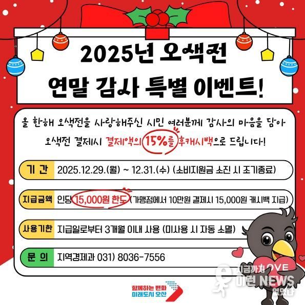 이런뉴스(e-runnews) 김삼성 기자 | 오산시는 한 해 동안 지역화폐를 이용해 준 시민들에게 감사의 뜻을 전하고, 연말 소비 활성화를 도모하기 위해 ‘2025년 오색전 연말 감사 특별 이벤트’를 추진한다.