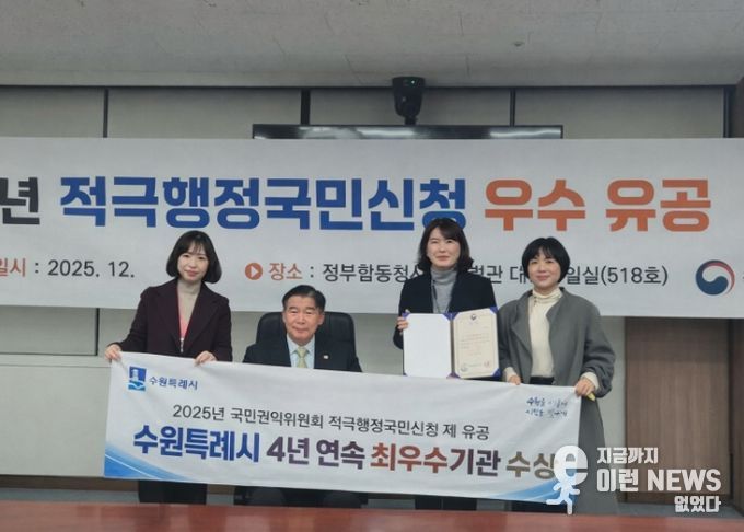 수원시는 24일 정부서울청사 정부합동민원센터에서 열린 2025 국민권익위원회 적극행정국민신청제 우수기관 시상식에서 상장을 받았다. 수원시는 적극행정국민신청제가 도입된 2022년부터 올해까지 4년 연속 우수기관으로 선정되는 성과를 거뒀다.