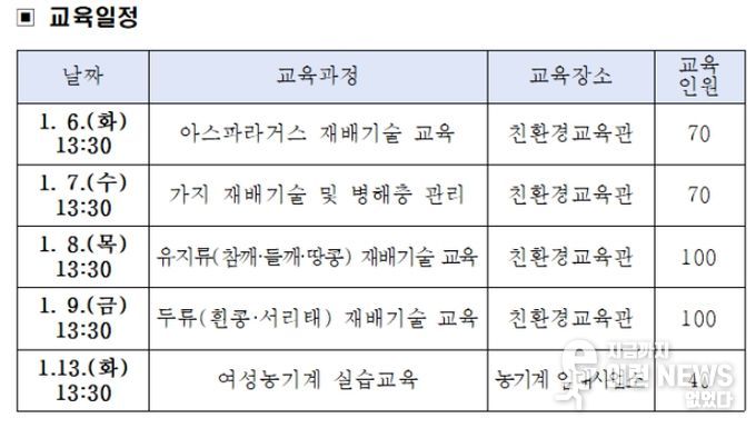 이런뉴스(e-runnews) 김삼성 기자 | 여주시는 오는 1월 6일부터 13일까지 '2026년 새해농업인실용교육'의 일환으로 밭작물 분야 전문교육을 본격 추진한다고 밝혔다.