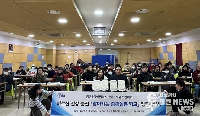 이런뉴스(e-runnews) 김삼성 기자 | 파주시 금촌3동은 지난 21일 3층 대회의실에서 관내 로뎀스킨케어와 지역 어르신들의 건강 증진을 위한 사회 공헌 업무 협약을 체결했다.