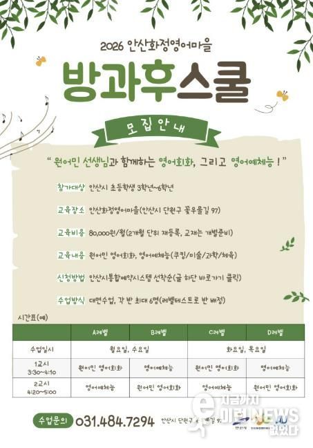 이런뉴스(e-runnews) 김삼성 기자 | 안산시가 설립하고 안산대학교가 운영하는 안산화정영어마을은 관내 초등학생을 대상으로 2026년 방과후 프로그램을 운영한다고 26일 밝혔다.