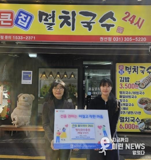 이런뉴스(e-runnews) 김삼성 기자 | 권선1동 행정복지센터는 1월 22일, 관내 음식점인 “큰집멸치국수”가 지역 내 취약계층을 위해 매월 5 가구에 멸치국수를 정기 후원하기로 했다고 밝혔다.