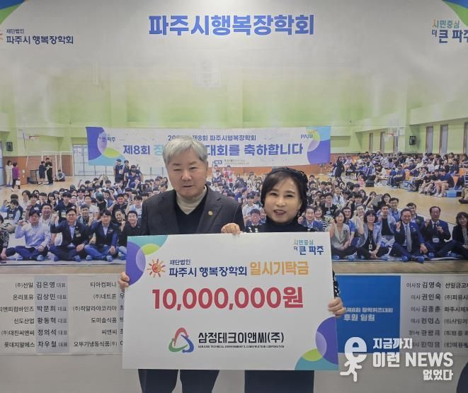 이런뉴스(e-runnews) 김삼성 기자 | 파주시는 (재)파주시행복장학회가 삼정테크이앤씨㈜로부터 일시기탁금 1천만 원을 전달받았다고 밝혔다.