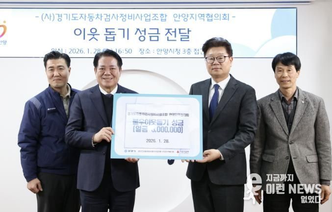 이런뉴스(e-runnews) 김삼성 기자 | 안양시는 28일 오후 4시 50분에 시청 3층 접견실에서 (사)경기도자동차검사정비사업조합 안양지역협의회가 설 명절을 앞두고 지역 내 어려운 이웃을 위해 사용해 달라며 성금 300만원을 기탁했다고 29일 밝혔다.