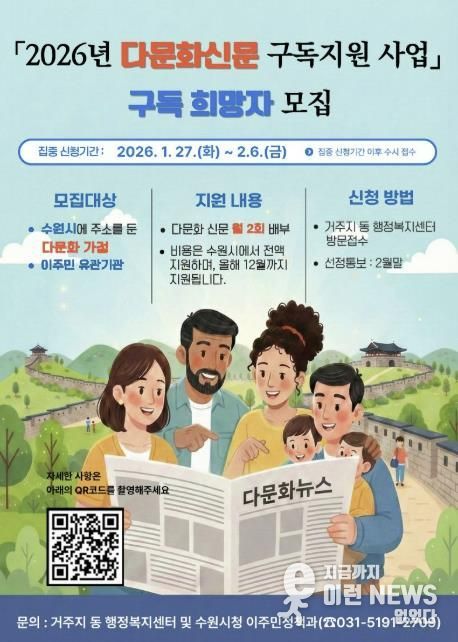이런뉴스(e-runnews) 김삼성 기자 | 수원특례시가 다문화가족의 한국 생활 적응을 돕기 위해 ‘다문화신문 구독 지원 사업’ 대상자를 모집한다.
