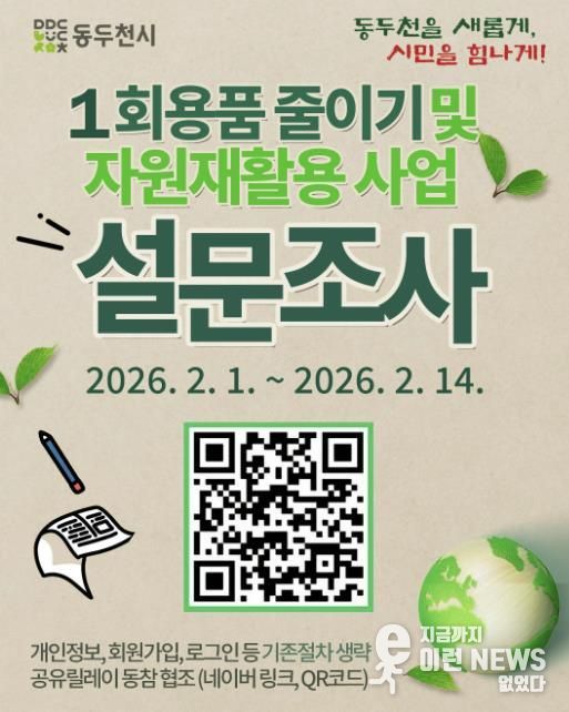 이런뉴스(e-runnews) 김삼성 기자 | 동두천시는 깨끗한 도시환경 조성을 위해 추진 중인 '1회용품 줄이기 및 자원 재활용 사업'의 기초자료로 활용하고자 시민 설문을 실시한다.