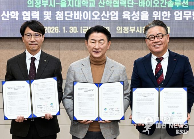의정부시는 1월 30일 시청 회룡홀에서 을지대학교 산학협력단(단장 김인식), ㈜바이오간솔루션(대표 송명석)과 ‘지산학 협력 및 첨단 바이오산업 육성을 위한 업무협약’을 체결했다.