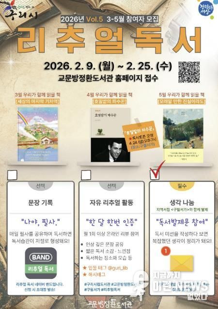 이런뉴스(e-runnews) 김삼성 기자 | 구리시 교문방정환도서관은 매월 한 권의 책을 시민과 함께 읽는 참여형 독서프로그램 '리추얼 독서'의 올해 첫 참여자를 오는 2월 9일부터 모집한다고 밝혔다.