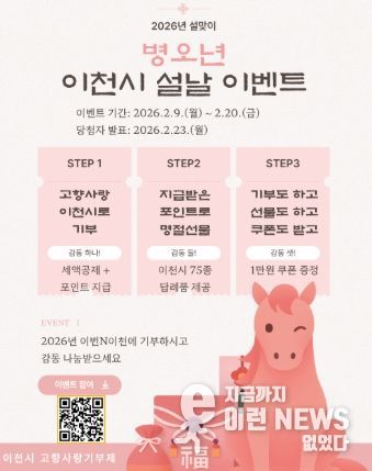이런뉴스(e-runnews) 김삼성 기자 | 이천시는 설 명절을 맞아 고향을 응원하는 따뜻한 마음이 기부로 이어질 수 있도록, 고향사랑기부제와 연계한 ‘설 명절 감동 나눔 이벤트’를 추진한다고 밝혔다.