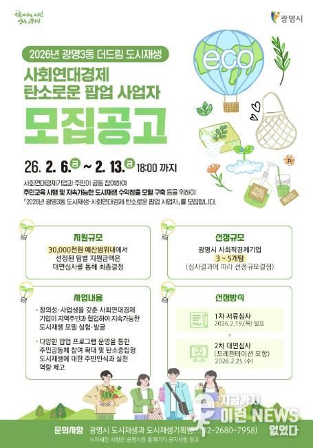 시는 오는 3월부터 12월까지 광명3동 더드림 도시재생사업의 일환인 ‘2026년 광명3동 도시재생-사회연대경제 탄소로운 팝업 사업’을 추진한다고 10일 밝혔다.