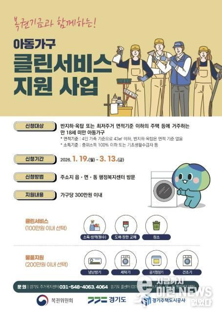 지원 대상은 만 18세 미만 아동이 포함된 가구로, 최저주거기준 미달 가구(4인 가구 기준 43㎡ 미만) 또는 반지하·옥탑 거주 가구, 기초생활수급자, 차상위계층, 한부모가족 등 저소득 가구다. 성남시는 예비자를 포함해 총 13가구를 모집한다.
