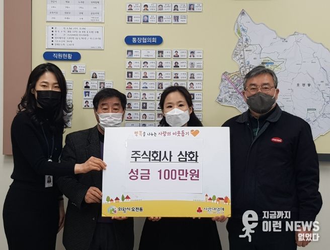 이런뉴스(e-runnews) 김삼성 기자 | 의왕시 오전동 소재 ㈜삼화피앤티는 지난 29일 오전동에 성금 100만원을 전달했다. 기탁된 성금은 사회복지공동모금회를 통해 저소득 취약계층 가구에 지원될 예정이다.