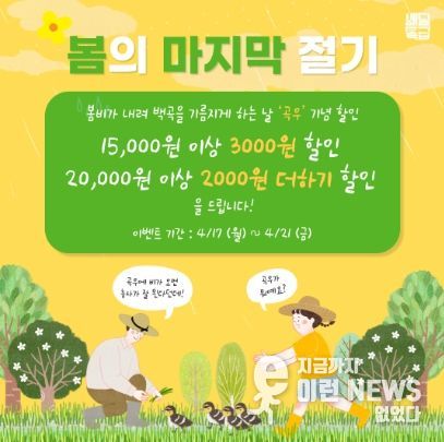 경기도주식회사 관계자는 “봄비가 내려 곡식을 영글게 한다는 절기 ‘곡우’를 맞아 소비자들이 맛있는 음식을 저렴하게 즐기실 수 있도록 이벤트를 준비했다”라고 많은 관심을 부탁했다.