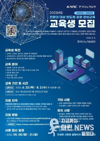 이런뉴스(e-runnews) 김삼성 기자 | 경기도와 한국나노기술원이 도내 전문대졸업(예정)자 대상 2023년도 반도체 공정·장비 교육생을 8일부터 21일까지 모집한다.