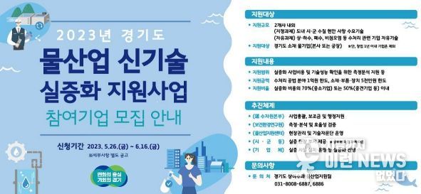 이런뉴스(e-runnews) 김삼성 기자 | 경기도는 ‘2023년 물산업 신기술 실증화 지원사업’에 참여할 물기업을 16일까지 추가 모집한다.