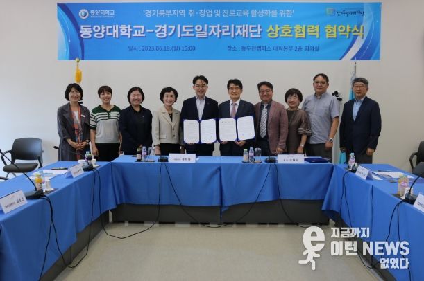 양 기관은 19일 동양대학교 동두천캠퍼스에서 ‘경기도일자리재단-동양대학교 업무협약식’을 진행했다. 협약식에는 경기도일자리재단 채이배 대표이사, 홍춘희 경영기획실장, 남운선 북부사업본부장, 동양대학교 이하운 총장, 허노정 동두천캠퍼스 본부장, 박해숙 취업학생처장 등 10여 명이 참석했다.