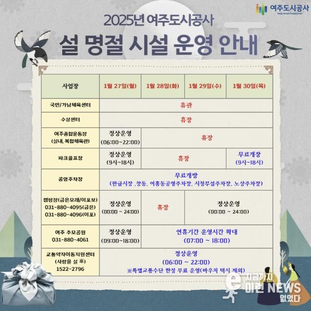 이런뉴스(e-runnews) 김삼성 기자 | 여주도시공사는 다가오는 설 연휴를 맞이하여 시민들과 귀성객들에게 편리하고 안전한 서비스를 제공하고자 주요 시설들의 운영시간을 조정하고, 일부 시설 특별 서비스를 제공할 예정이라고 밝혔다.