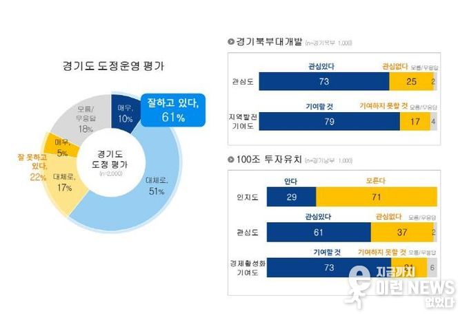 경기남부지역 도민 1천 명을 대상으로 한 조사에서는 ‘100조 투자유치’에 대한 기대감이 두드러졌다. 남부지역 도민은 투자유치 정책에 대한 인지도는 29%로 낮았으나, 관심도는 61%에 달했고, 일자리 창출과 지역경제 활성화에 기여할 것이라는 응답도 73%로 높게 나타났다.