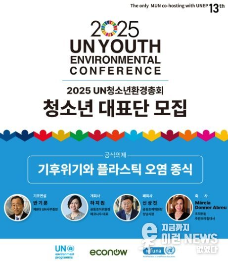 이런뉴스(e-runnews) 김삼성 기자 | 성남시청소년청년재단 판교유스센터와 환경단체 에코나우는 오는 11월 15일부터 16일까지 이틀간 성남 국립국제교육원에서 열리는 ‘2025 UN청소년환경총회’에 참가할 국내외 청소년 대표단 300명을 10월 13일까지 모집한다. 이번 총회는 성남시청소년청년재단 판교유스센터와 환경단체 에코나우가 공동 주관하며, 반기문 전 UN사무총장과 브라질 대사 등 주요 인사가 참석한다.