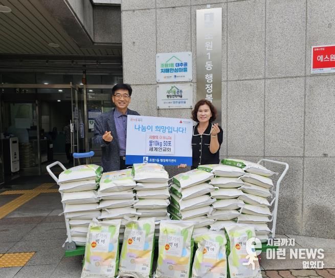 이런뉴스(e-runnews) 김삼성 기자 | 수원시 장안구 조원1동 대한예수교장로회 세계인교회는 지난 1일, 추석 명절을 맞이하여 조원1동 행정복지센터에 백미10kg 50포를 전달했다.