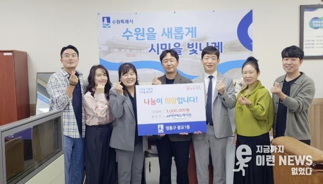 이런뉴스(e-runnews) 김삼성 기자 | 수원시 영통구 광교1동은 ㈜이언에듀케이션으로부터 이웃돕기 성금 300만원을 기탁받았다고 밝혔다.