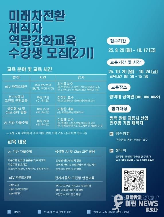 이런뉴스(e-runnews) 김삼성 기자 | 평택시와 평택산업진흥원이 ‘미래차 전환 재직자 역량 강화교육’ 2기 과정을 개설한다. 교육은 10월 20일부터 24일까지 교육 운영기관인 평택대학교에서 진행되며, 지역 자동차 산업 재직자를 대상으로 미래차 핵심 분야 전문지식을 제공한다.