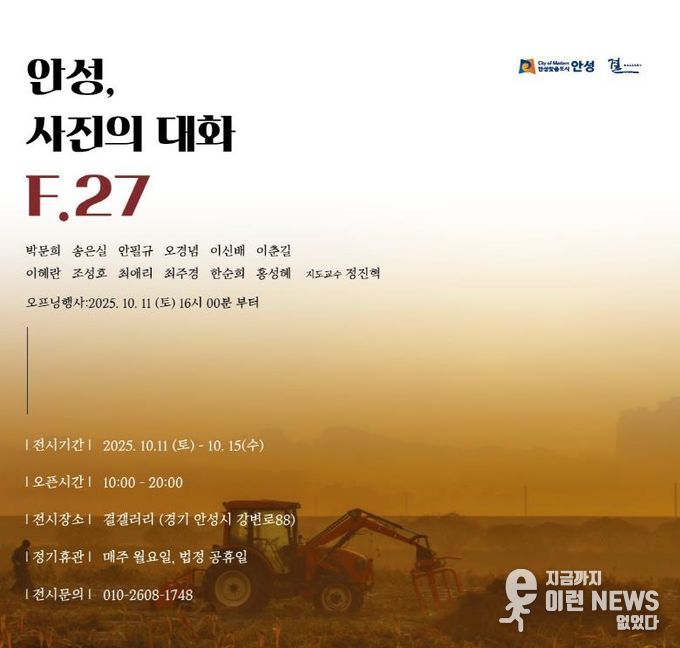 이런뉴스(e-runnews) 김삼성 기자 | 안성시 사진동아리 F.27 photo가 오는 10월 11일부터 15일까지 안성천 작은미술관 결갤러리에서 전시회 ‘안성, 사진의 대화 F.27’을 개최한다. 이번 전시는 동아리 회원 18명이 참여해 안성의 자연환경과 사람들의 이야기를 기록한 작품을 선보인다.