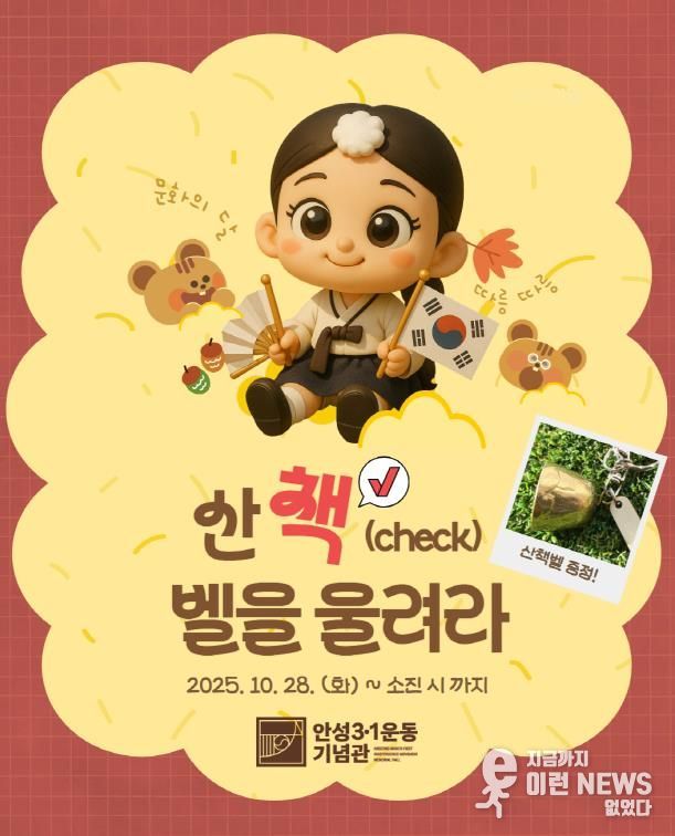 이런뉴스(e-runnews) 김삼성 기자 | 안성3.1운동기념관은 10월 문화의 달을 맞이하여 10월 28일(화)부터 특별 체험활동 “산책(Check) 벨을 울려라”를 진행한다.