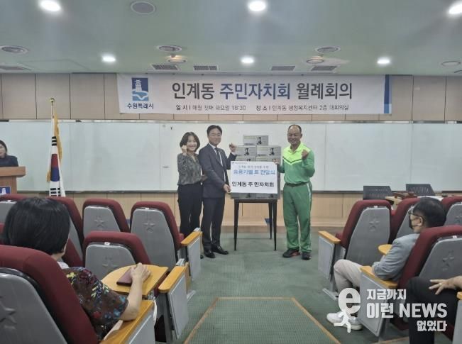 이런뉴스(e-runnews) 김삼성 기자 | 수원시 팔달구 인계동 주민자치회는 지난 10월 1일, 가을철 관내 낙엽청소용 송풍기 벨트(100만 원 상당)를 인계동 행정복지센터에 전달했다.