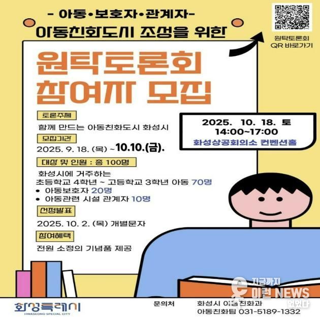 이런뉴스(e-runnews) 김삼성 기자 | 화성특례시가 오는 18일 오후 2시 화성상공회의소 컨벤션홀에서 개최되는 ‘아동친화도시 조성을 위한 원탁토론회’ 참가자를 모집한다고 2일 밝혔다.