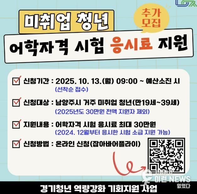 이런뉴스(e-runnews) 김삼성 기자 | 남양주시는 10월 13일부터 미취업 청년을 대상으로 어학·자격 시험 응시료 지원 신청을 추가로 받는다고 2일 밝혔다.