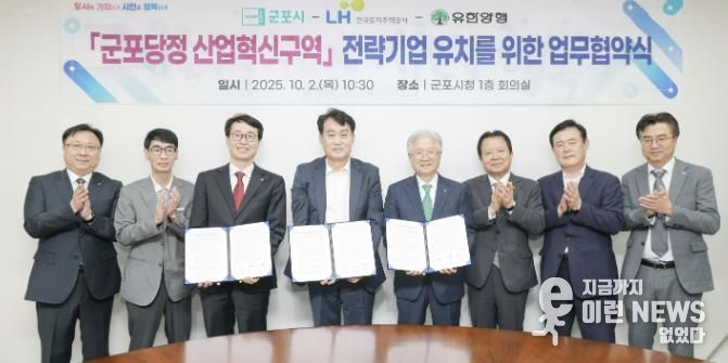 이런뉴스(e-runnews) 김삼성 기자 | 군포시는 2일 군포시청에서 한국토지주택공사(LH), ㈜유한양행과 ‘군포당정 산업혁신구역’ R·D 전략기업 유치를 위한 업무협약을 체결했다고 밝혔다.