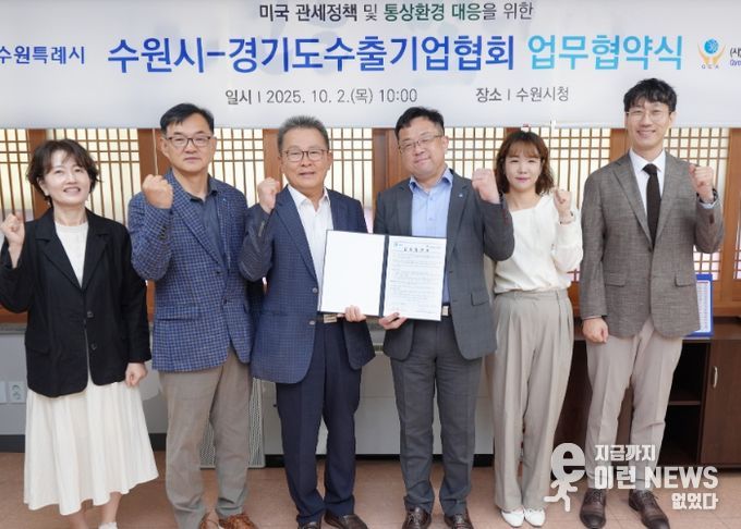 수원시는 수출지원기관 경기도수출기업협회는 2일 수원시청에서 업무협약을 체결하고, 관세 피해 기업 지원을 위해 협력하기로 했다. 협약식에는 김현수 수원시 제1부시장, 강성호 경기수출기업협회 회장 등이 참석했다.