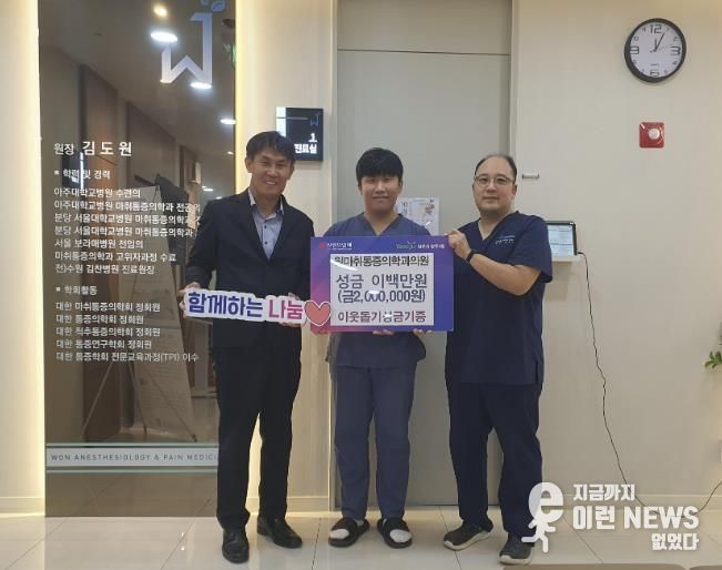 이런뉴스(e-runnews) 김삼성 기자 | 양주시 양주2동이 지난 1일 관내 원마취통증의학과의원에서 추석을 맞이하여 이웃돕기 성금 200만 원을 양주2동에 기탁했다고 밝혔다.