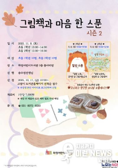 이런뉴스(e-runnews) 김삼성 기자 | 고양특례시 화정어린이도서관은 오는 11월 8일 ‘고소하고 향긋한 보늬밤 보틀케이크’를 만들어보는 그림책 동화요리 프로그램‘그림책과 마음 한 스푼-시즌2’를 운영한다.