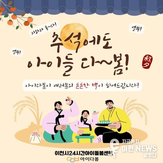 이런뉴스(e-runnews) 김삼성 기자 | 이천시는 추석 연휴 기간에도 이천시 24시간 아이돌봄센터인 ‘아이다봄’을 365일 24시간 정상 운영해 연휴 중 발생할 수 있는 돌봄 공백을 최소화한다고 밝혔다.