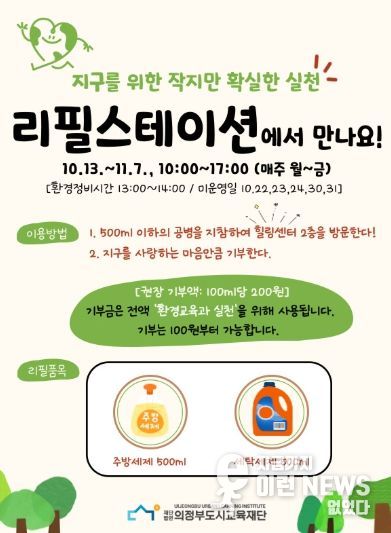 이런뉴스(e-runnews) 김삼성 기자 | (재)의정부도시교육재단은 10월 13일부터 11월 7일까지 매주 월요일부터 금요일, 오전 10시부터 오후 5시까지 힐링센터 2층에서 생활 속 친환경 실천 활동 ‘리필스테이션’을 운영한다.
