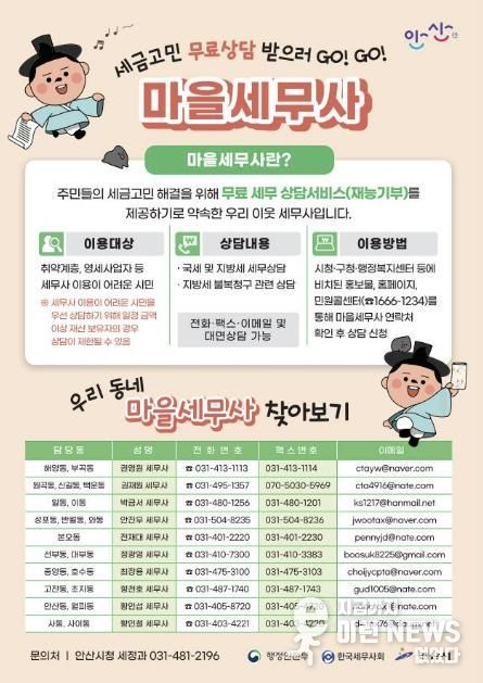 이런뉴스(e-runnews) 김삼성 기자 | 안산시는 올해 말까지 시민들에게 전문적인 세무 상담을 제공하기 위한 ‘제5기 마을세무사’ 제도를 운영한다고 10일 밝혔다.