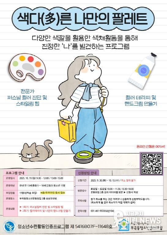 부곡동청소년문화의집 관계자는“이번 프로그램을 통해 청소년들은 다채로운 색채로 자신을 탐색하고 자존감을 높이는 의미 있는 시간을 갖게 될 것”이라며 “앞으로도 청소년 맞춤형 자기계발 프로그램을 적극 발굴하고 운영해 나가겠다”고 전했다.