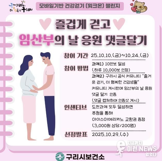이런뉴스(e-runnews) 김삼성 기자 | 구리시는 제20회‘임산부의 날’(10월 10일)을 기념해 임신과 출산의 가치를 되새기고 시민 건강 증진을 도모하기 위한 ‘즐겁게 걷고, 임산부의 날 응원 댓글 달기’ 챌린지를 오는 10월 10일부터 24일까지 15일간 운영한다고 밝혔다.