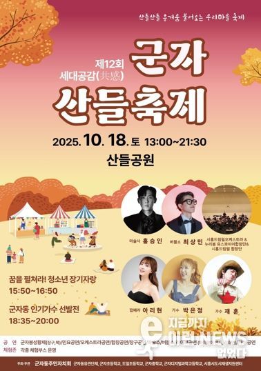 이런뉴스(e-runnews) 김삼성 기자 | 시흥시 군자동 주민자치회는 오는 10월 18일 오후 1시부터 거모동 산들공원에서 ‘제12회 세대공감(共感) 군자 산들축제’를 개최한다.