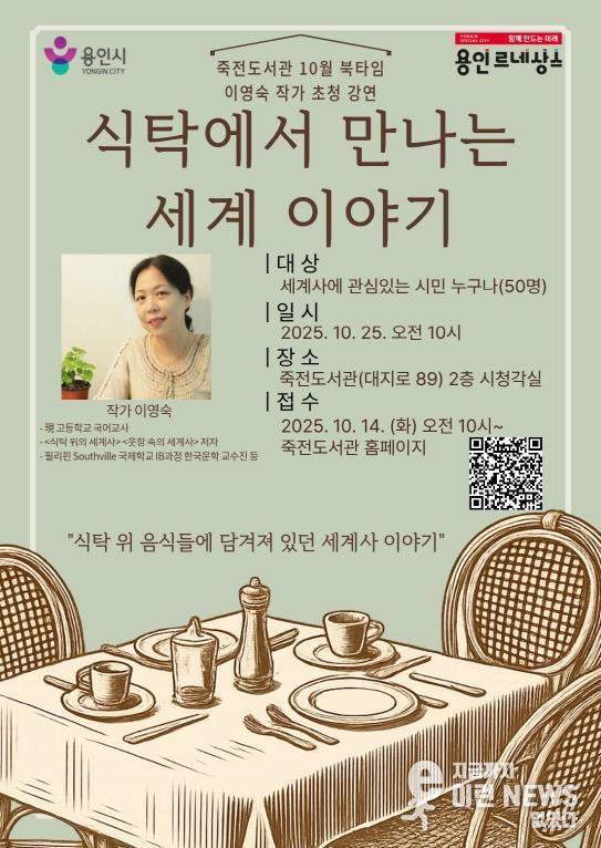 이런뉴스(e-runnews) 김삼성 기자 | 용인특례시는 25일 오전 10시 죽전도서관 시청각실에서 죽전도서관 북타임 작가초청강연회 ‘식탁에서 만나는 세계 이야기’를 연다고 13일 밝혔다.