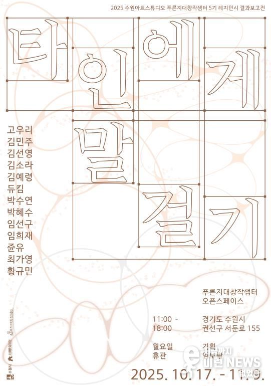 이런뉴스(e-runnews) 김삼성 기자 | 수원문화재단은 오는 10월 17일부터 11월 9일까지 약 3주간 탑동 시민농장에 자리한 수원아트스튜디오 푸른지대창작샘터에서 5기 레지던시 참여작가 13인의 올 한 해 작품 활동 성과를 공유하는 결과보고전 '타인에게 말 걸기'를 개최한다.