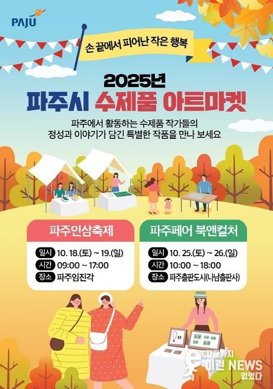 이런뉴스(e-runnews) 김삼성 기자 | 파주시는 오는 18일부터 19일까지 이틀간 열리는 ‘파주인삼축제’와 오는 25일부터 26일까지 개최되는 ‘파주페어_북앤컬처’ 행사장에서 지역 수공예 작가들이 참여하는 ‘수제품 아트마켓’을 운영한다.