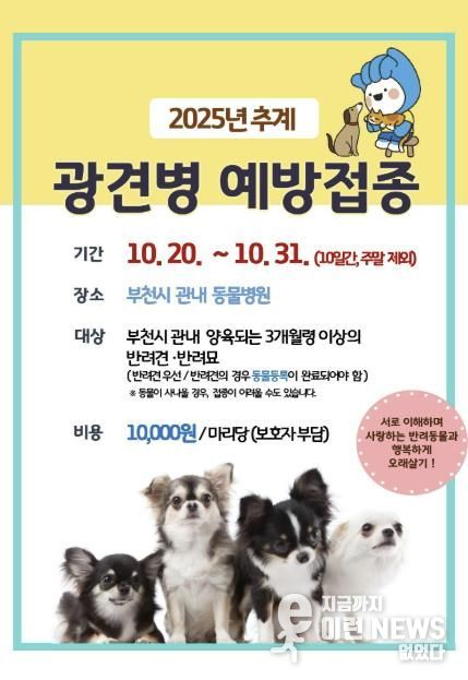 이런뉴스(e-runnews) 김삼성 기자 | 부천시는 10월 20일부터 31일까지 토요일과 일요일을 제외한 평일에 관내 동물병원 71곳에서 ‘추계 광견병 예방접종’을 실시한다.