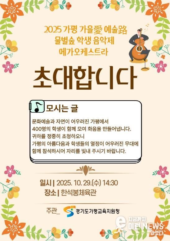 이런뉴스(e-runnews) 김삼성 기자 | 경기도가평교육지원청이 주관하는 ‘2025 가평 가을愛 예술路 물별숲 학생 음악제 메가오케스트라’가 10월 29일 오후 2시 30분, 가평군 한석봉체육관에서 열린다.