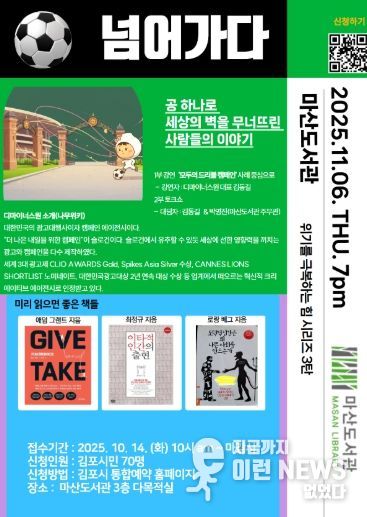 이런뉴스(e-runnews) 김삼성 기자 | 마산도서관은 오는 11월 6일 19시, 본관 3층 다목적실에서 ‘공 하나로 세상의 벽을 무너뜨린 사람들의 이야기’ 프로그램을 운영한다고 밝혔다.