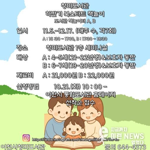 이런뉴스(e-runnews) 김삼성 기자 | 이천시 청미도서관은 오는 11월 5일부터 12월 17일까지, 유아와 보호자를 대상으로 ‘하반기 북스타트 책놀이’ 프로그램을 운영한다.