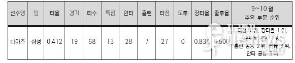 9~10월 MVP로 선정된 디아즈에게는 상금 300만원과 트로피가 전달될 예정이다.