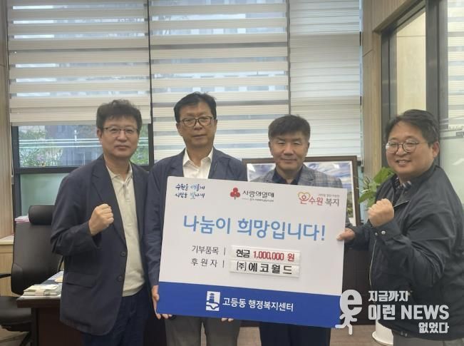 이런뉴스(e-runnews) 김삼성 기자 | 수원시 팔달구 고등동은 10월 13일, 사회적기업 ㈜에코월드로부터 관내 취약계층을 위한 이웃돕기 성금 100만원을 전달받았다고 밝혔다.